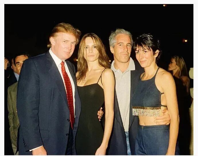 这张图像文件展示的是爱泼斯坦的一张书桌,书桌的桌面、拉开的抽屉中摆放着涉及现任总统特朗普、前总统克林顿等人的敏感照片。其中特朗普共“出镜”两次,一张照片是他与多名艳丽女子的合影,另一张是特朗普夫妇、爱泼斯坦与其情妇麦克斯韦的合照。