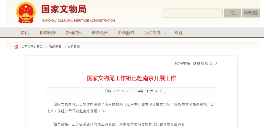国家文物局对近日媒体报道的“南京博物院《江南春》图卷现身拍卖市场”等相关情况高度重视,已成立工作组并于日前赴南京开展工作。
