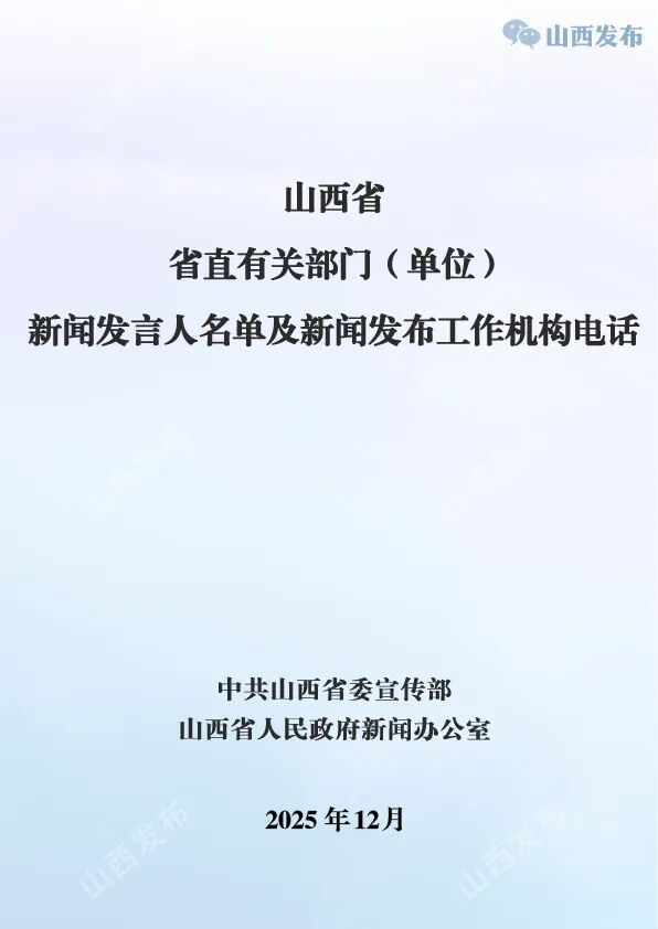 2025年12月23日,中共山西省委宣传部(山西省人民政府新闻办公室)向社会公布省直有关部门(单位)新闻发言人名单及新闻发布工作机构电话。