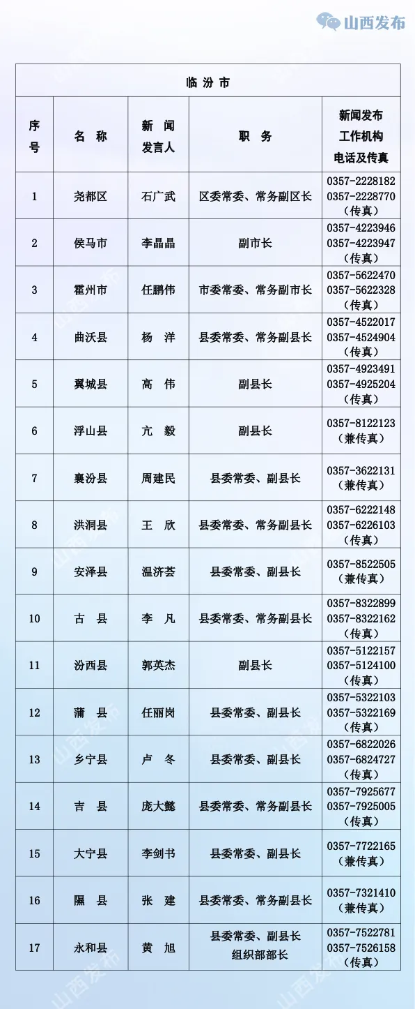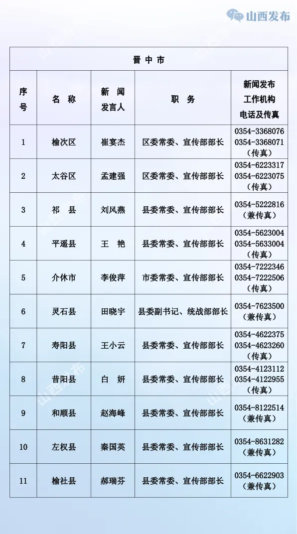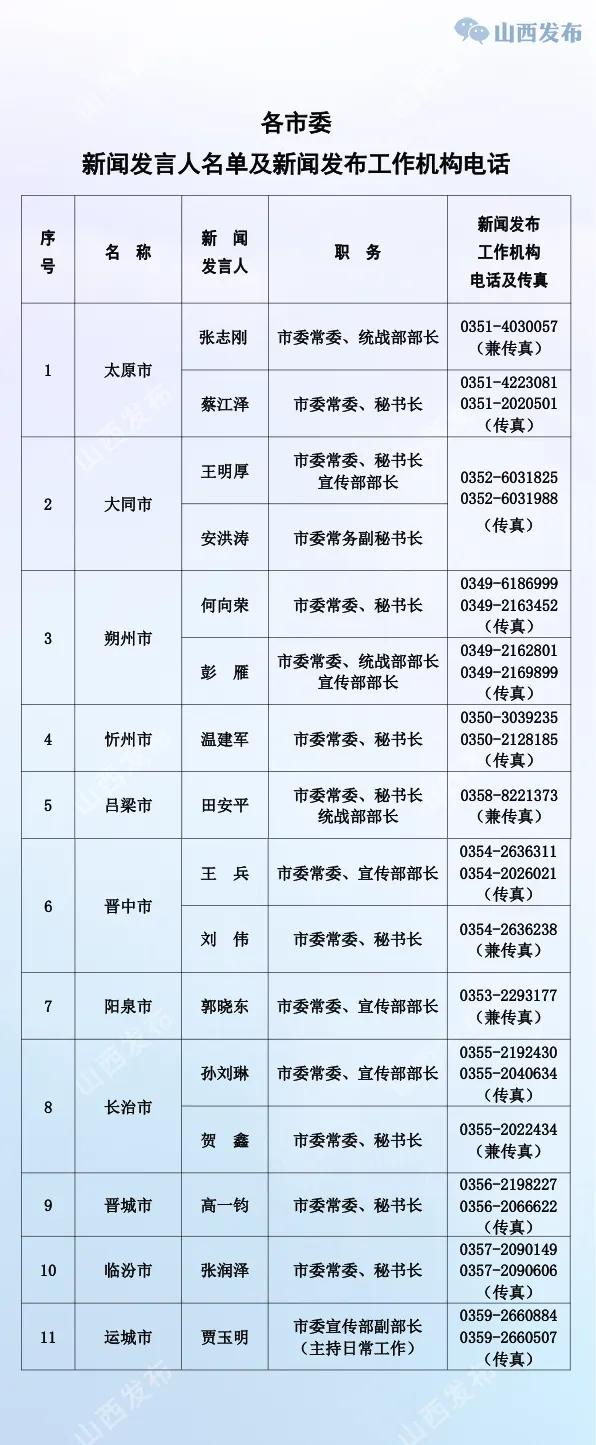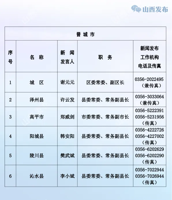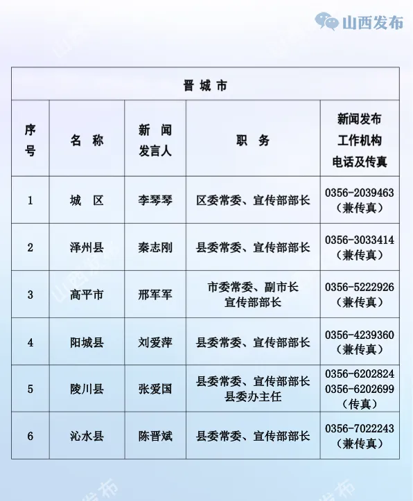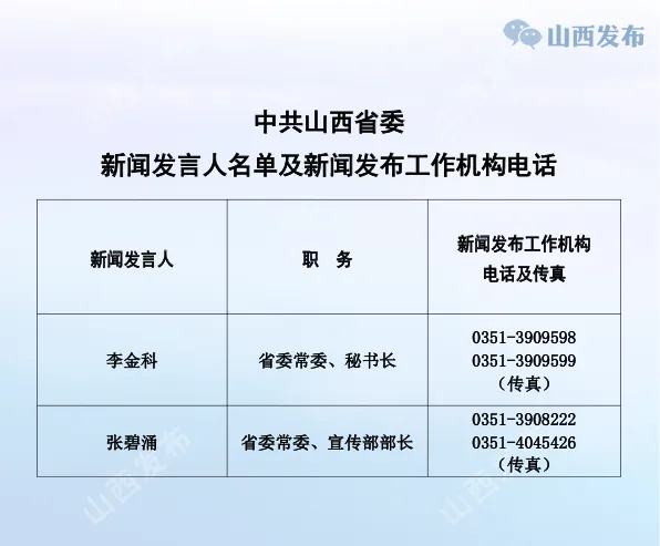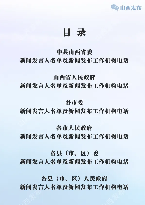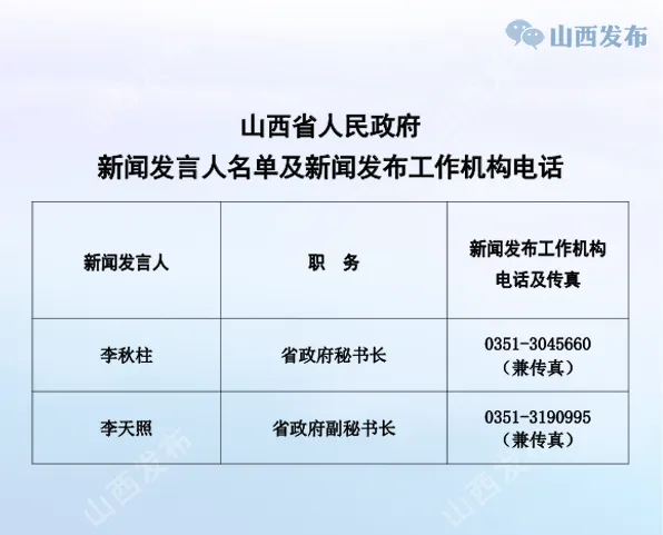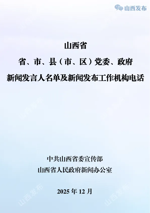 2025年12月23日,中共山西省委宣传部(山西省人民政府新闻办公室)向社会公布省、市、县(市、区)党委、政府新闻发言人名单及新闻发布工作机构电话。