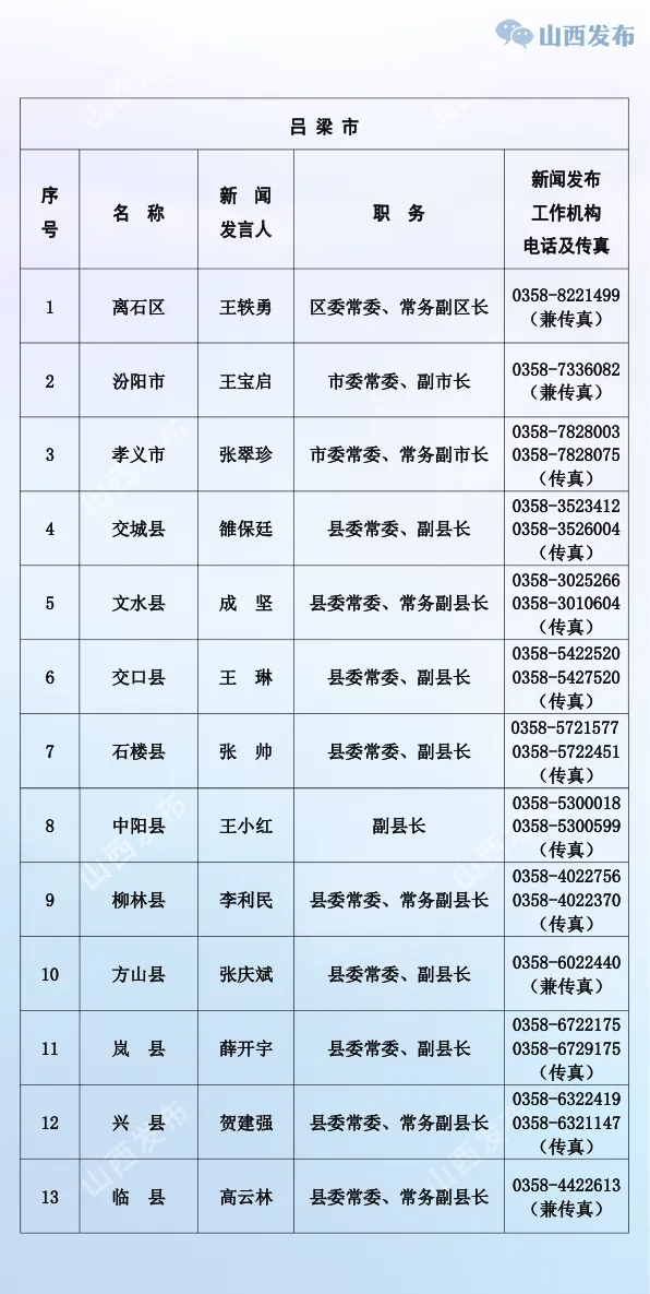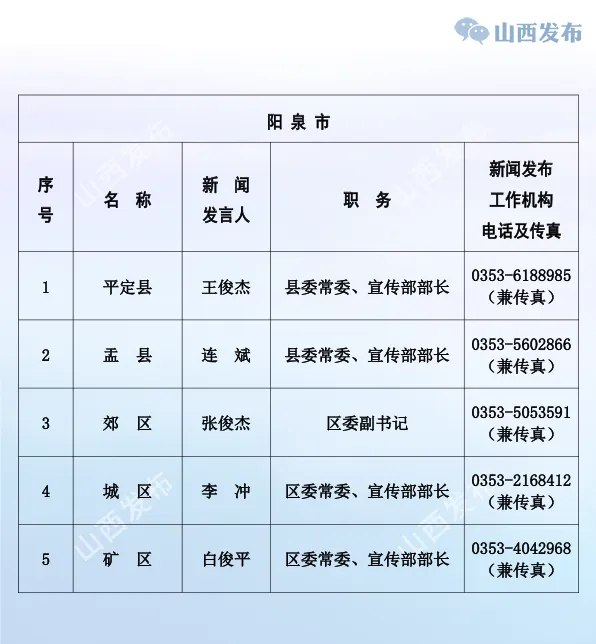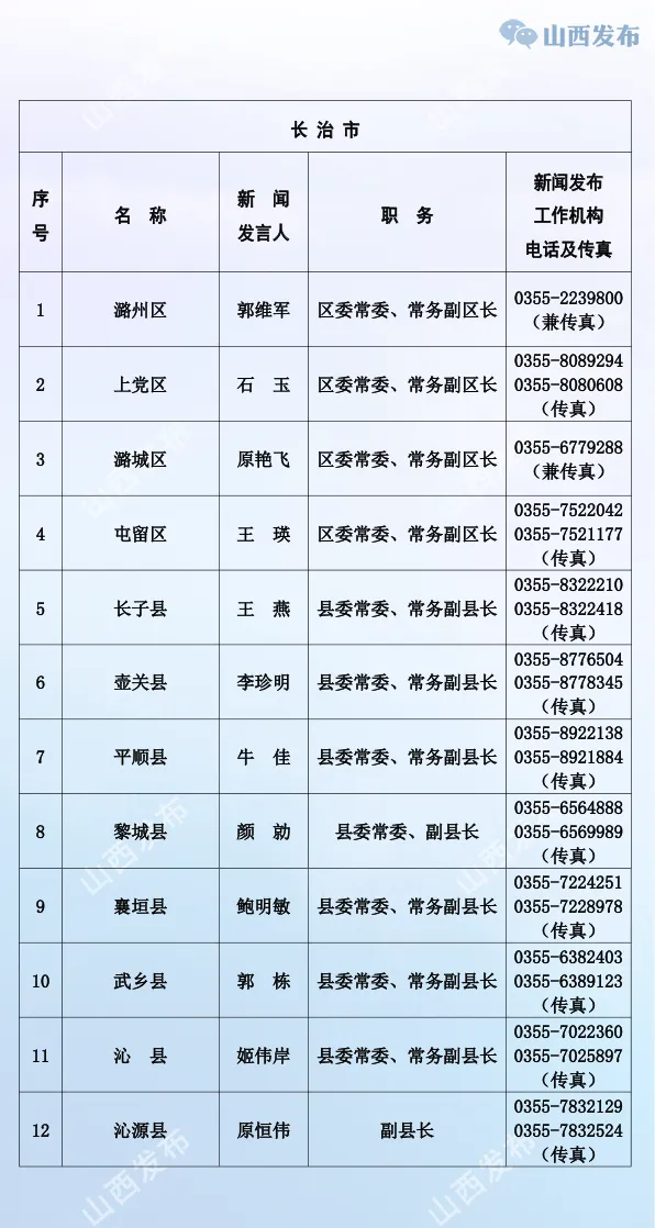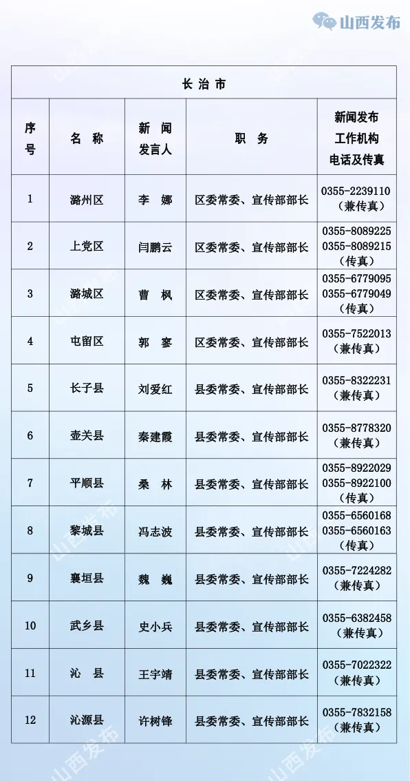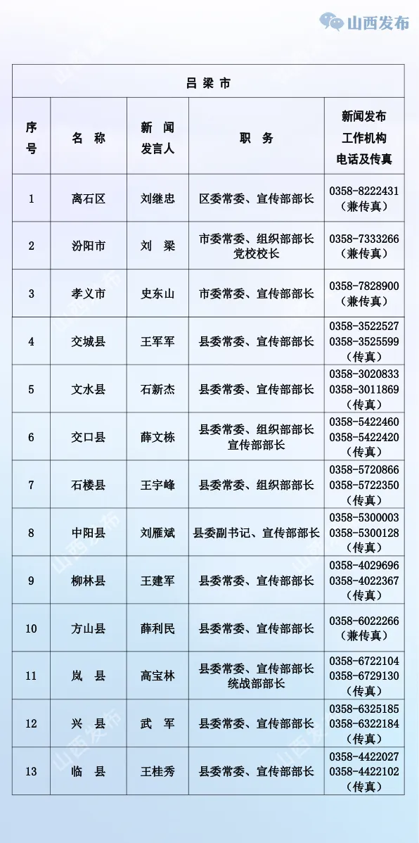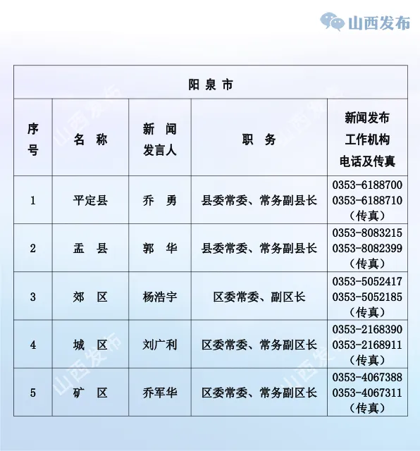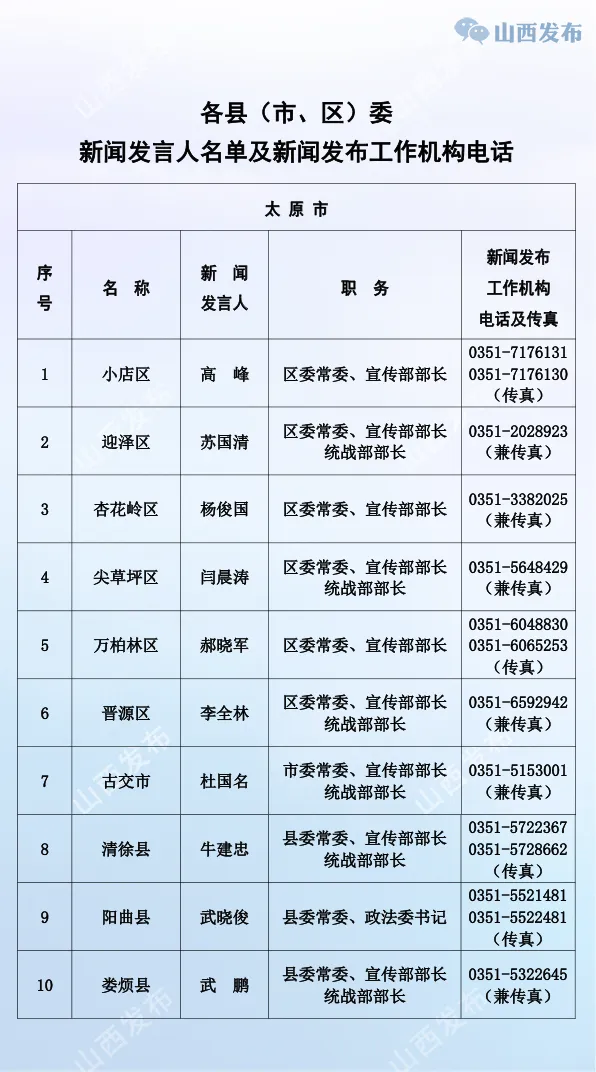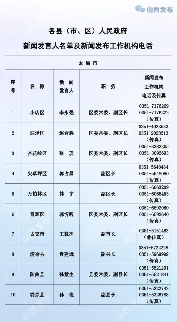 2025年12月23日,中共山西省委宣传部(山西省人民政府新闻办公室)向社会公布省、市、县(市、区)党委、政府新闻发言人名单及新闻发布工作机构电话。