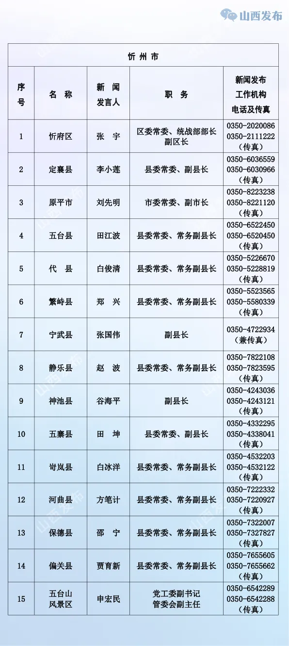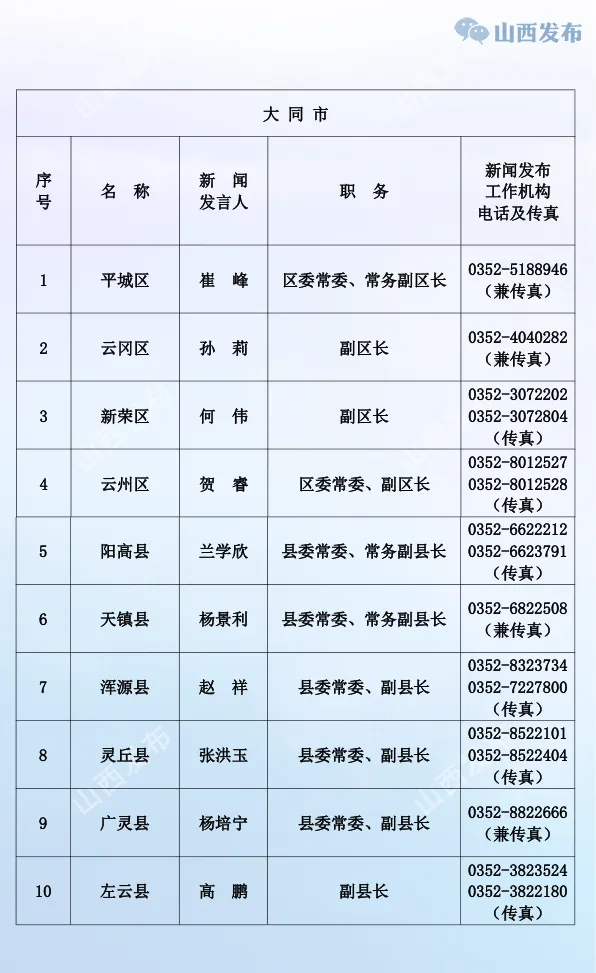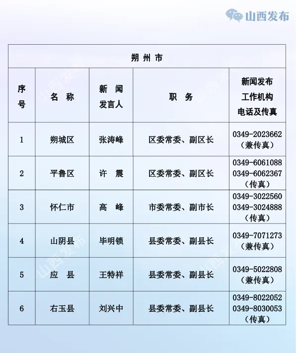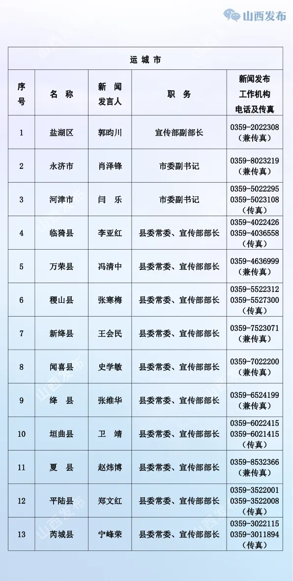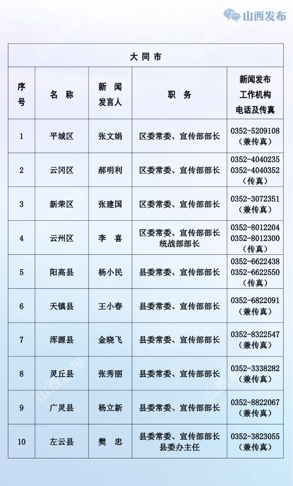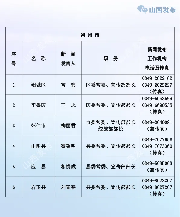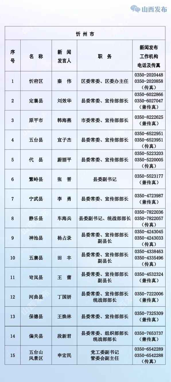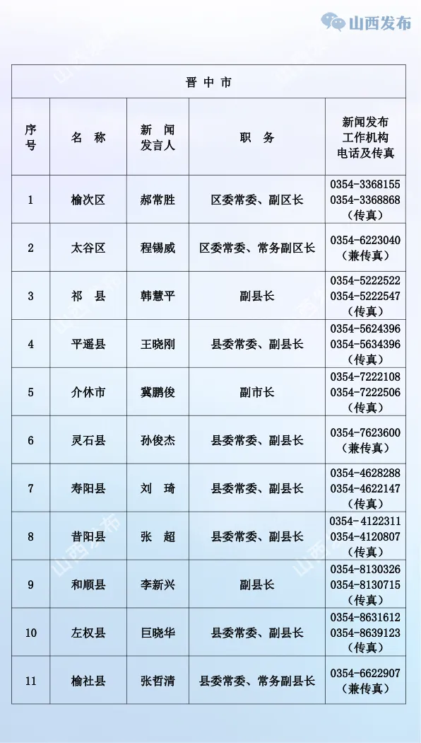 2025年12月23日,中共山西省委宣传部(山西省人民政府新闻办公室)向社会公布省、市、县(市、区)党委、政府新闻发言人名单及新闻发布工作机构电话。