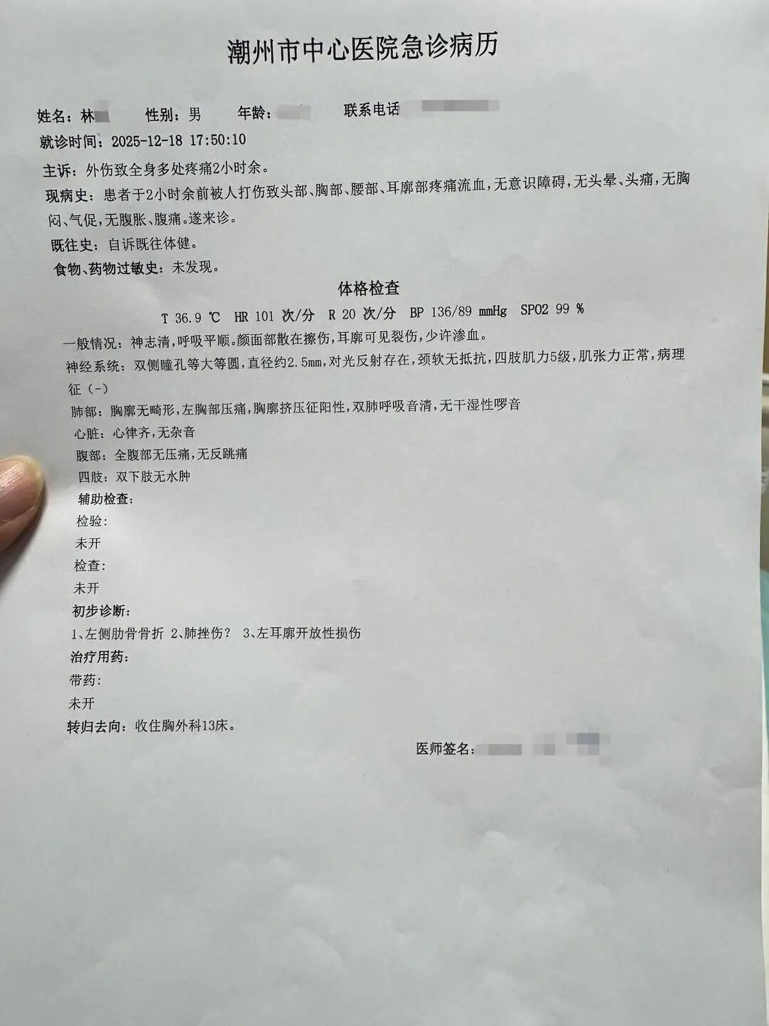 事发后,林先生被送往潮州市中心医院就诊。医院开具的急诊病历显示,林先生左侧肋骨骨折、肺挫伤、左耳廓开放性损伤。