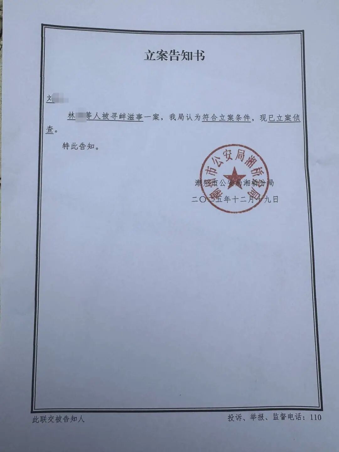 12月19日,据潮州市湘桥公安分局出具了立案告知书,林先生等人被寻衅滋事一案,该局认为符合立案条件,现已立案侦查。