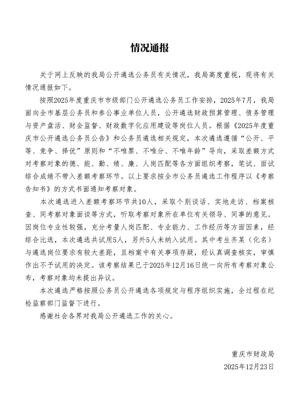 12月23日,重庆财政局发布情况通报,称本次遴选进入差额考察环节共10人,采取个别谈话、实地走访、档案核查、同考察对象面谈等方式,听取考察对象所在单位有关领导、同事的意见。因岗位专业性较强,充分考量人岗匹配、专业能力、工作经历等方面因素,经综合比选,本次遴选共试用5人,另外5人未纳入试用。其中考生齐某(化名)与遴选岗位要求有较大差距,且档案中有关事项存疑,经认真调查核实,审慎作出不予试用的决定。该考察结果已于2025年12月16日统一向所有考察对象公布,考察对象均未提出异议。