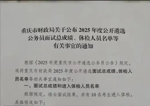 12月16日,重庆市财政局公示“2025年度公开遴选公务员拟试用人员名单”中没有齐某的名字,公示时间自12月17日至12月23日,报考"综合管理2"岗位第二名和那位并列第三名的考生均在公示名单中。
