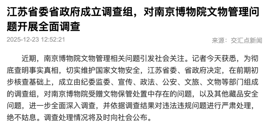 12月23日,新华日报记者获悉,为彻底查明事实真相,切实维护国家文物安全,江苏省委、省政府决定,在前期初步核查基础上,成立由纪委监委、宣传、政法、公安、文旅、文物等部门组成的调查组,对南京博物院受赠文物保管处置中存在的问题,以及其他藏品安全问题,进一步全面深入调查,并依据调查结果对违法违规问题进行严肃处理,绝不姑息。调查处理情况将及时向社会公布。