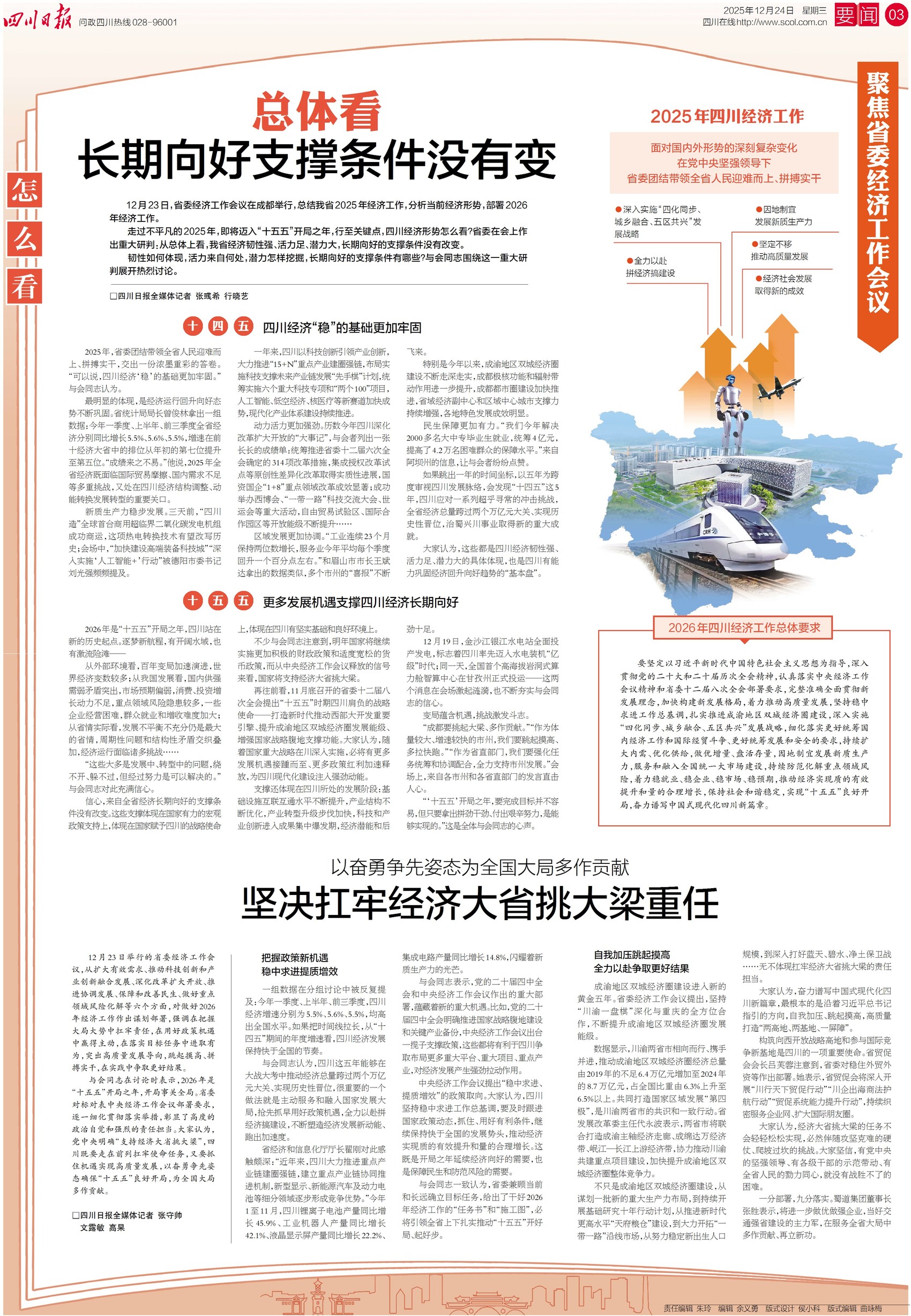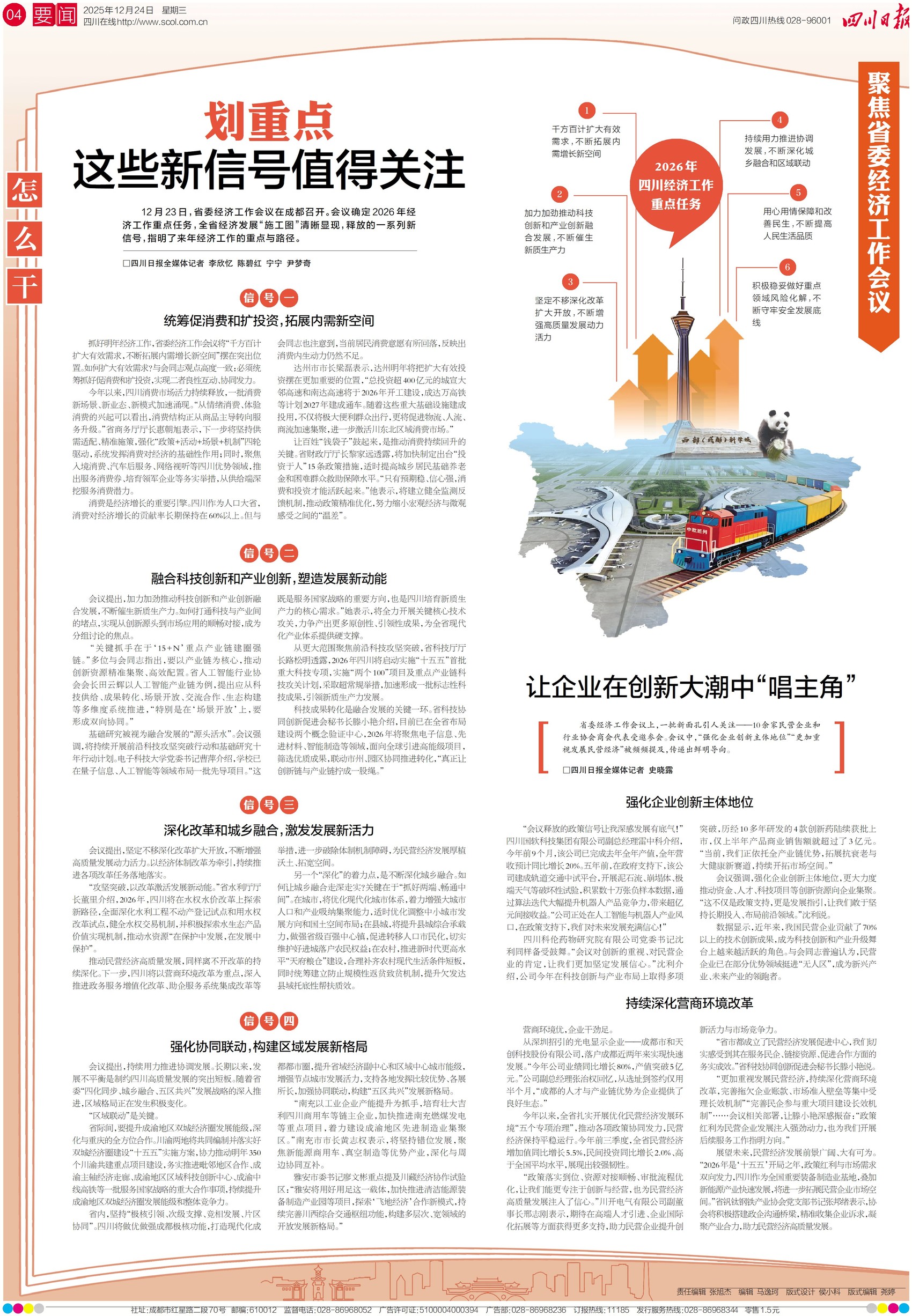 昨日,省委经济工作会议在成都举行,学习贯彻中央经济工作会议精神,总结我省2025年经济工作,分析当前经济形势,部署2026年经济工作。十四五期间,我省坚决扛起经济大省挑大梁责任,让经济“稳”的基础更加牢靠;十五五开局,我省部署六大重点任务,指明来年经济工作重点与路径。哪些新信号值得关注?本报今日推出“聚焦省委经济工作会议”特别报道,为您“划重点”!
