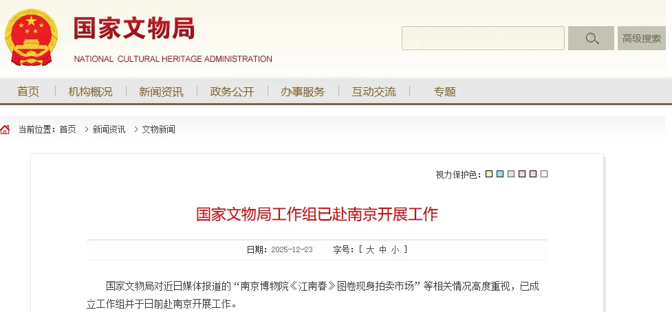 国家文物局对近日媒体报道的“南京博物院《江南春》图卷现身拍卖市场”等相关情况高度重视,已成立工作组并于日前赴南京开展工作。