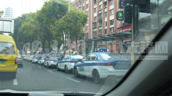 浅黄色公交车前方的公交站内,停满候客出租车。