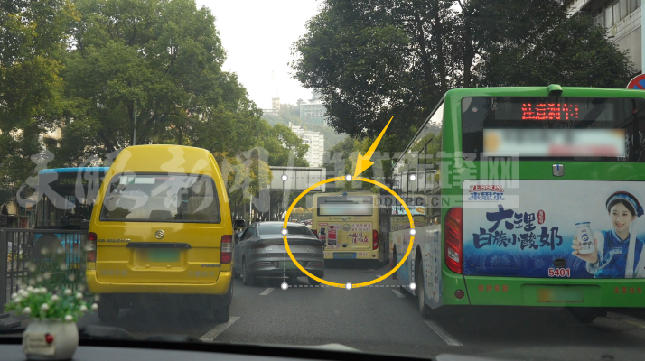 浅黄色公交车(箭头处)占用两条车道斜着进站停靠。