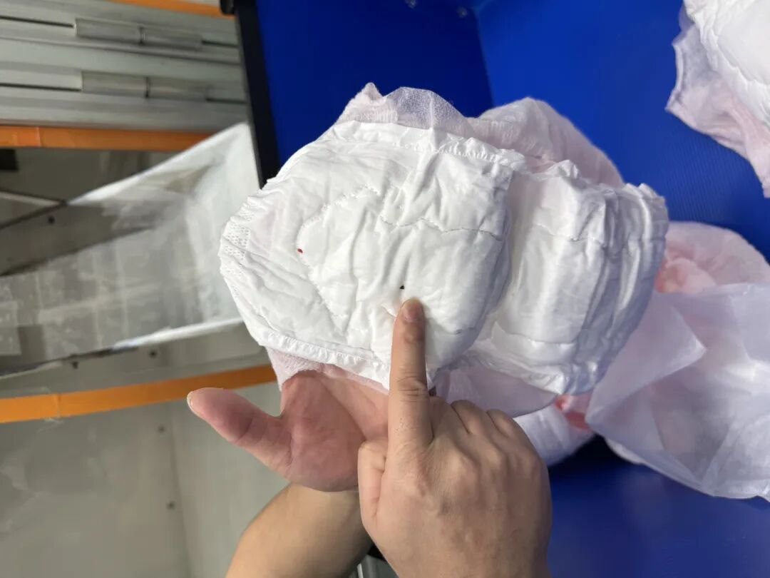 在苏菲安心裤的产线,当无纺布原材料上被标记着直径很小的污点、肉眼观察几乎看不到的油墨点时,会发生什么?