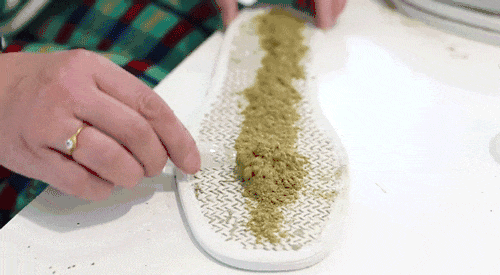所有材料按比例配好、研磨成粉,铺满鞋底夹层。