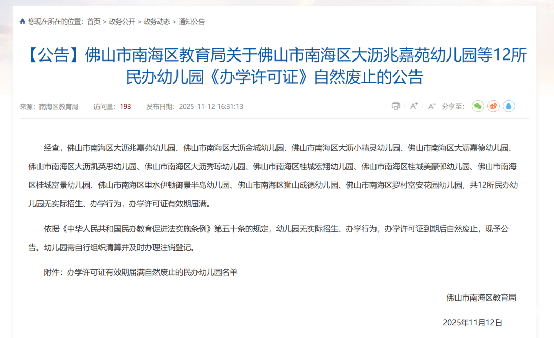 11月12日,佛山市南海区人民政府公示,区内12所民办幼儿园,因无实际招生、办学行为,办学许可证到期废止。记者注意到,其中不乏开办时间超20年的“老字号”,如位于桂城的富景幼儿园创办于1999年,至2024年仍有发布幼儿园招生相关信息,开园已超20年。此外,也有诸如2020年创办的大沥嘉德幼儿园,存在未超5年就已经谢幕。
