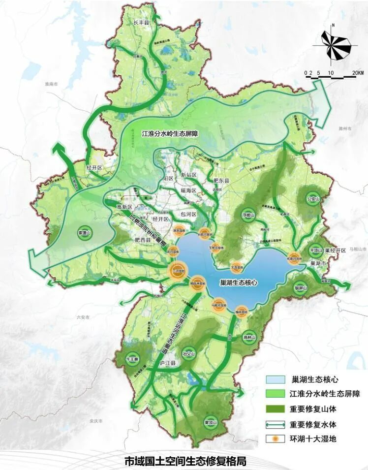 记者通过公示稿了解到,在总体布局上,《规划》将凸显巢湖生态一体化保护修复,保护修复以重要水系与山脉为廊道和绿环、重要生态区域为绿楔的生态本底格局,构建全市“一湖多廊、三环三楔”的国土空间生态修复格局。