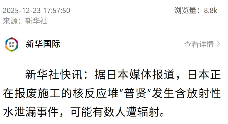 据日本媒体报道,日本正在报废施工的核反应堆“普贤”发生含放射性水泄漏事件,可能有数人遭辐射。