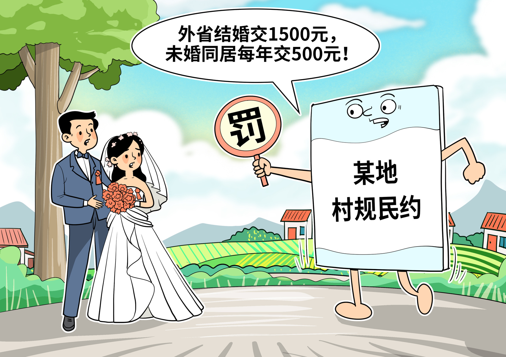 如今,一个没有立法权和执法权的村民小组,却推出含有“外省结婚交1500元”等内容的村规民约,这是对婚姻自由的干涉。此外,“从结婚到生小孩不足月,罚款3000元”“夫妻吵架干部来处理罚500元/人”“未婚住在一起500元/年”等规定,更是无稽之谈。比如“未婚先孕罚款3000元”,未婚先孕行为虽然未必妥当,但远未上升到违法的严重程度,纵观相关法律,也没有对未婚先孕进行处罚的规定,且为了保障婴幼儿合法权益,即便是婚外生育等情形,也应按照规定为其办理户籍登记,依法提供社保等保障。而“未婚住在一起”同样只是不受《中华人民共和国民法典》保护的行为,但不属于违法行为。