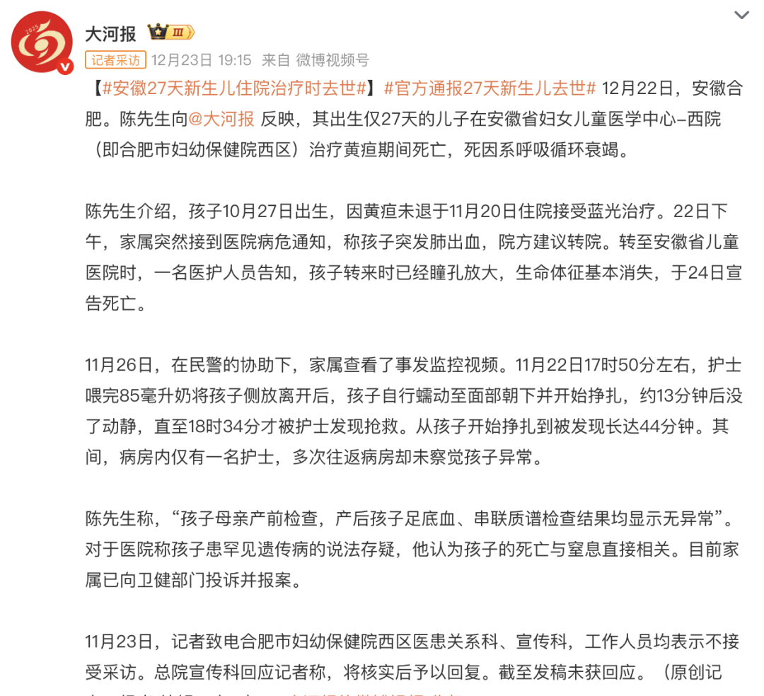 此前,据大河报消息,12月22日,安徽合肥的陈先生反映,其出生仅27天的儿子在安徽省妇女儿童医学中心-西院(即合肥市妇幼保健院西区)治疗黄疸期间死亡,死因系呼吸循环衰竭。