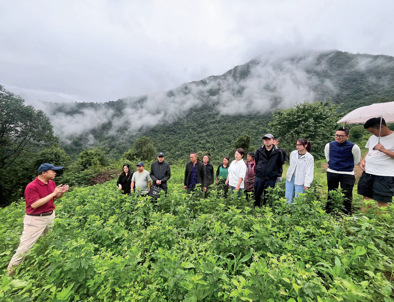 陈杰(左)在茂县宝鼎中药材种植专业合作社指导药材田间管理技术。供图/受访者