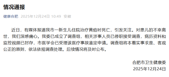 据此前媒体报道,12月22日,安徽合肥的陈先生向记者反映,其出生仅27天的儿子在安徽省妇女儿童医学中心-西院(即合肥市妇幼保健院西区)治疗黄疸期间死亡。据死亡证明显示,死因系呼吸循环衰竭。陈先生在查看监控后发现,孩子曾在病床上面部朝下挣扎10多分钟后没了动静,约半小时后才被护士发现异常进行抢救。