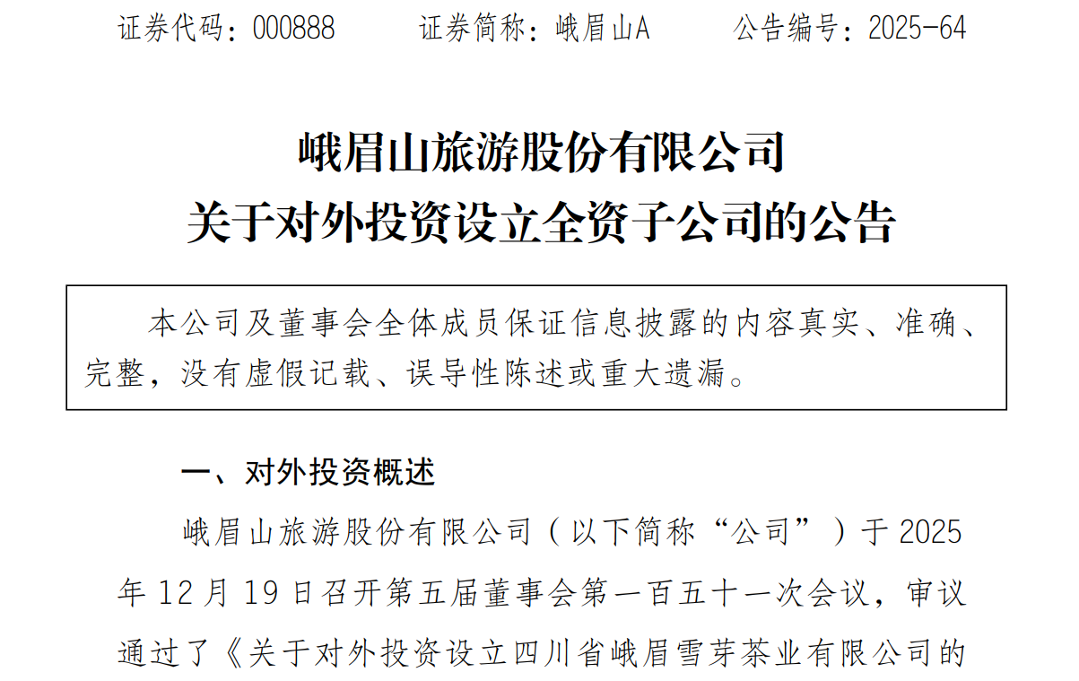 12月22日晚间,峨眉山旅游股份有限公司(证券简称“峨眉山A”)发布公告称,为进一步整合峨眉山文旅与茶叶资源,增强“峨眉雪芽”市场占有率和产品竞争力,培育新的利润增长点,公司拟出资1000万元,投资设立全资子公司四川省峨眉雪芽茶业有限公司(以下简称“峨眉雪芽茶业公司”)。