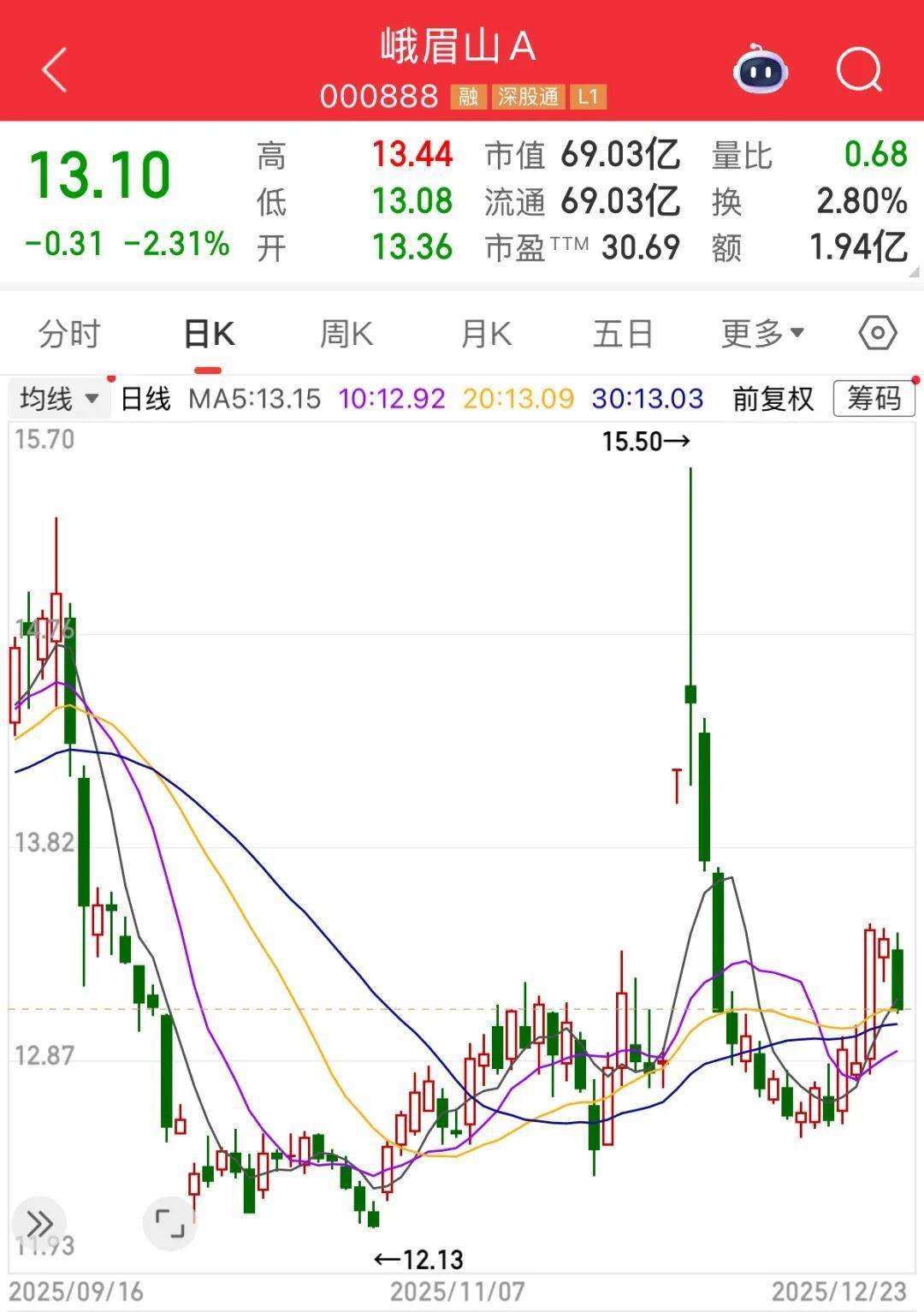 二级市场方面,截至23日收盘,峨眉山A下跌2.31%,报13.10元/股,总市值69.03亿元。