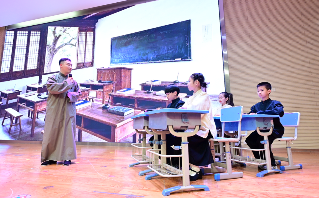 文化雅韵与少年意气的碰撞,是本届学子节最耀眼的亮色。运动赛场之上,足、篮、排健儿们龙腾虎跃,奔跑的身影似追风的雏鹰,挥洒的汗水折射出朝阳的光芒,呐喊声里激荡着“少年负壮气,奋烈自有时”的豪情;相声《好好说话》以诙谐幽默的语言,探讨网络流行语与传统汉语言文化的交融碰撞,在亦庄亦谐间引发学子对文化传承的深度思考;“飞花令”诗词对决环节,从垂髫稚子到青葱少年,皆化身诗词达人,带“国”字的佳句脱口而出,“捐躯赴国难,视死忽如归”的慷慨,“愿得此身长报国,何须生入玉门关”的豪迈,让千年文脉在唇齿间流转生香。书画社的少年们挥毫泼墨,笔走龙蛇间,家国情怀凝于尺幅素笺;“跨越千年的飞天之约”情景对话,将万户飞天的千古夙愿与“神舟”遨游、“嫦娥”探月的当代辉煌相连,让科技报国的种子在少年心中悄然扎根、破土生长。