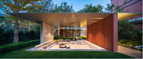 步入门庭,云多拉灰大理石列阵相迎,脚下滨州青花岗岩通铺,两旁的流水清音,成为了归家的第一曲禅音。进入园中,“一廊六道七庭院”的景观骨架娓娓道来隐奢的禅思:三座大师级艺术廊架构筑的归家动线,通过陶板、格栅、大理石景墙、绿植等结合,让视线与心灵在「迎·转·合」的空间叙事中,自由延展,彻底放松;举步环游,文化会客厅、下沉式庭院、多点景观休息区等,在半隐半现间静立,再配以石椅、木条凳、小组沙发等,让户外场域更有温度;若夜间归家,见光不见灯的设计,将为园境渲染梦幻的归家情境,织就情感共鸣的夜间桃源。