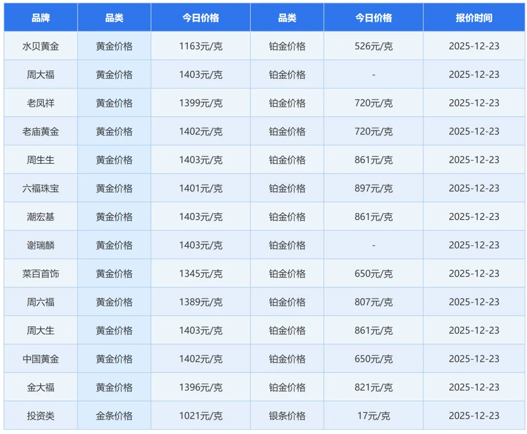 受国际金价大涨影响,国内首饰金价昨日(12月23日)出现明显上涨。多家黄金品牌隔夜齐涨,每克上调35至36元,部分饰品金价首破1400元/克,再刷国内纪录。