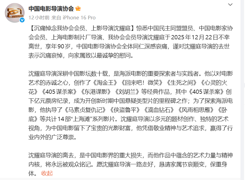记者从上影集团获悉,中国民主同盟盟员、中国电影家协会会员、上海电影家协会会员、中国电影导演协会会员、上海电影制片厂导演沈耀庭于2025年12月22日因病医治无效,不幸离世,享年90岁。