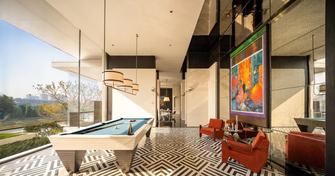 相比同系作品,沐芳洲在此理念上进一步迭代。在这个多维架空空间里,规划了高差近10米约740㎡的下沉庭院、约1600㎡的室内恒温泳池、健身房等会所,并设置了层高约7.2米的童玩空间、阶梯书吧等多功能场所。丰盛的配套与服务,旨在提升居住品质与幸福感。