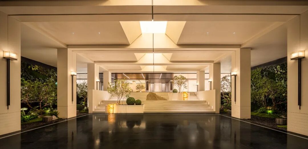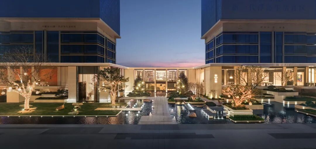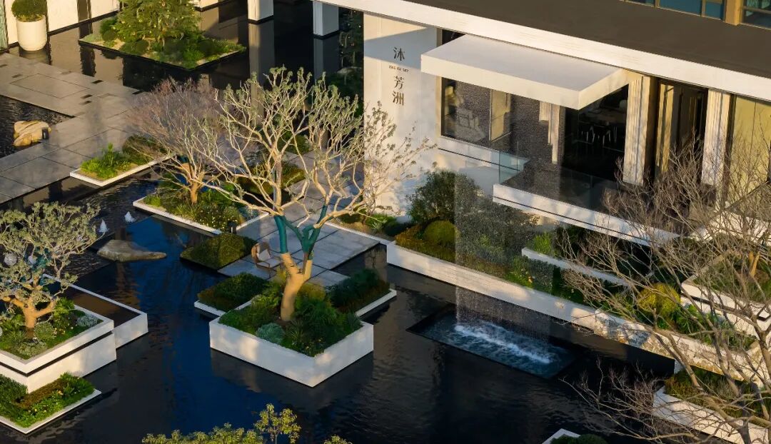 项目将大面水景置于社区前场,结合绿植、流瀑、雕塑等,构筑了令人印象深刻的入口界面。