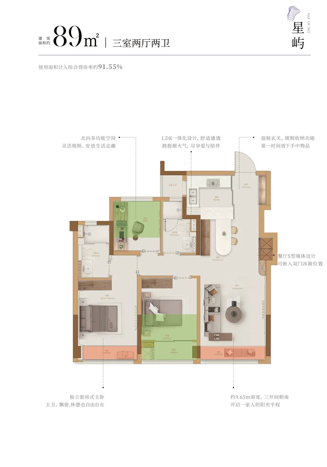 沐芳洲全盘建筑面积约89㎡-132㎡,通过阳台面积延伸、巧妙设置飘窗等手法,部分户型实际得房率可达约100%。