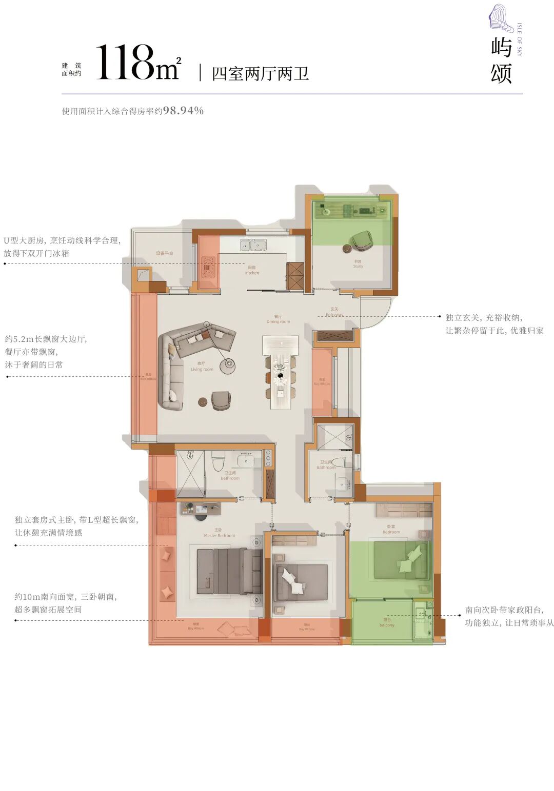 118㎡户型则拓展了7个飘窗与2个阳台,其室内使用面积可与市面上部分139㎡户型持平。