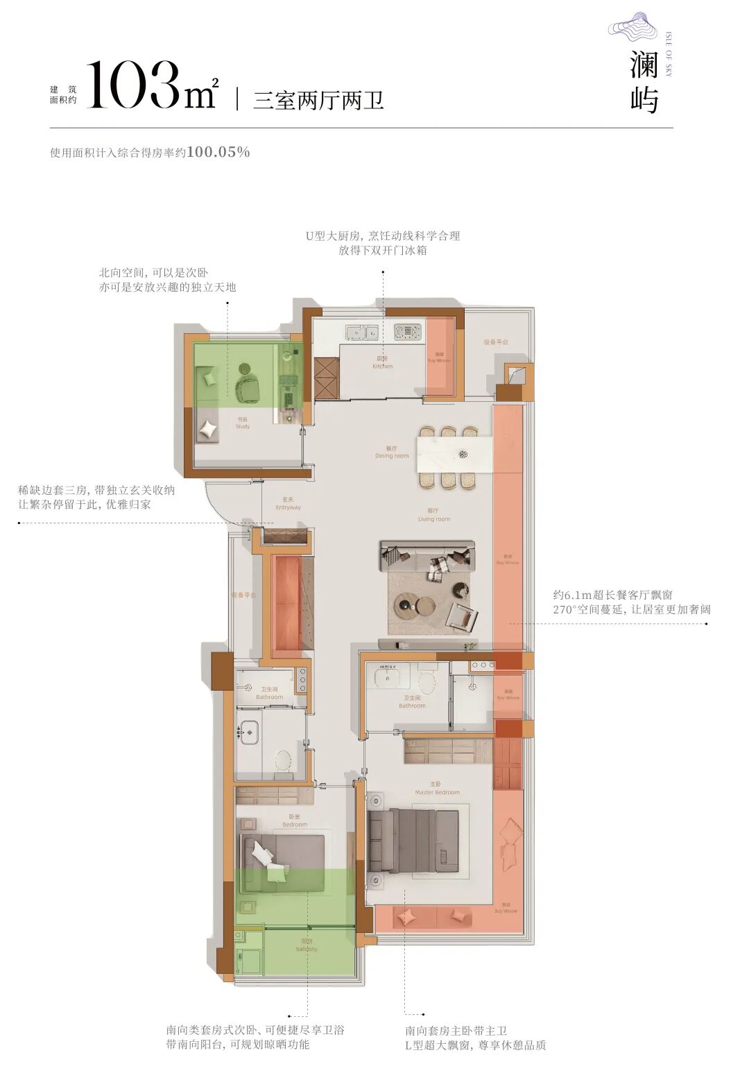 103㎡边套户型,厨房与客厅的飘窗经改造后,可变为操作台面或收纳柜,赠送面积超25.5㎡,空间利用率极高。