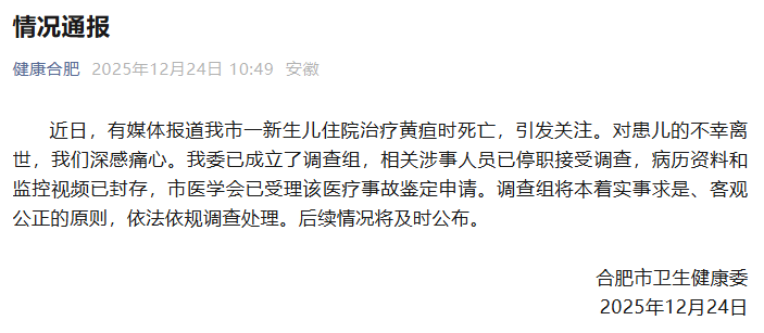 近日,有媒体报道我市一新生儿住院治疗黄疸时死亡,引发关注。对患儿的不幸离世,我们深感痛心。我委已成立了调查组,相关涉事人员已停职接受调查,病历资料和监控视频已封存,市医学会已受理该医疗事故鉴定申请。调查组将本着实事求是、客观公正的原则,依法依规调查处理。后续情况将及时公布。