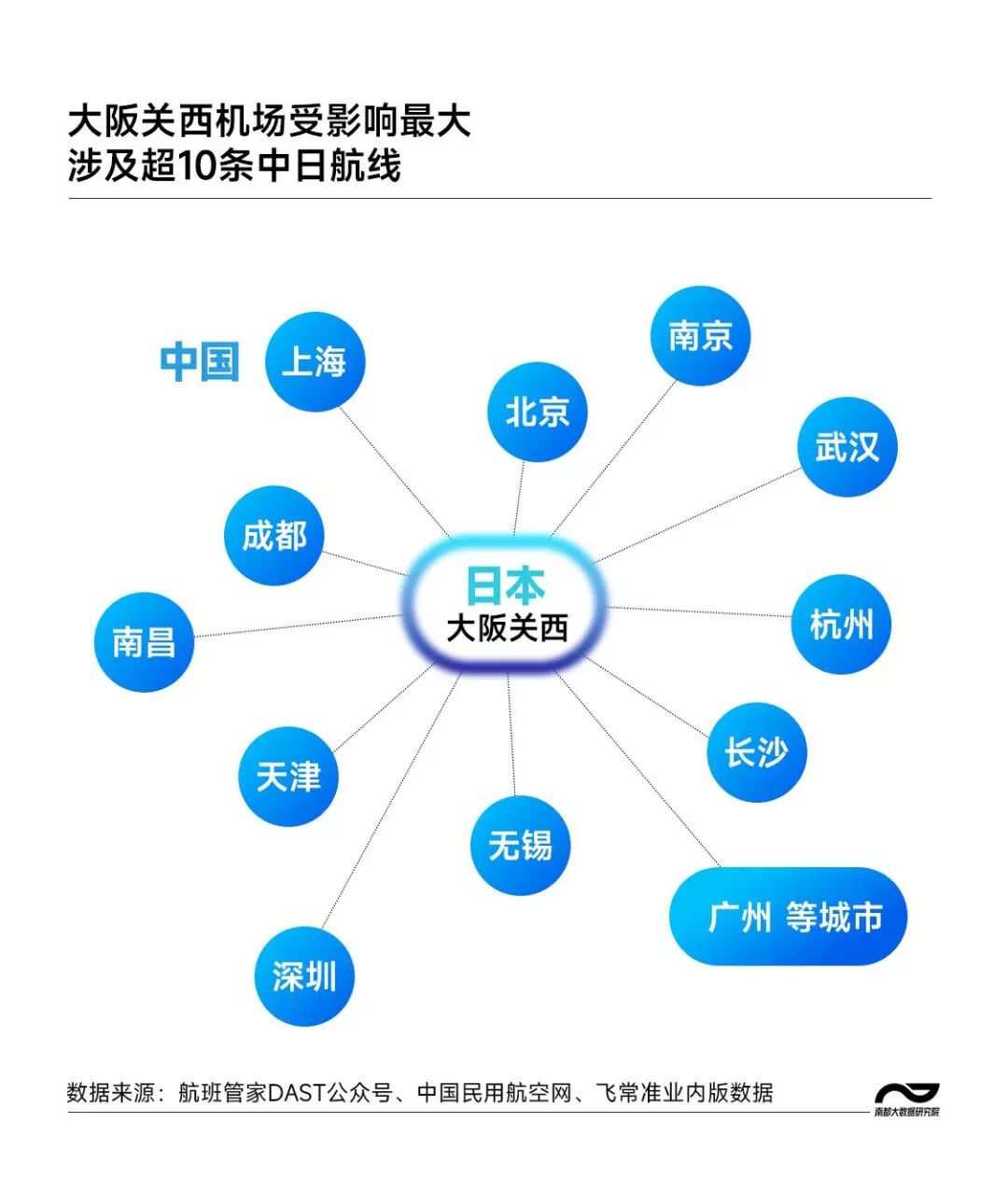 大阪三大机场包括了关西国际机场、伊丹机场和神户机场,而关西机场作为中方航点直飞最多的日方目的地,在本次航班调整中受明显影响,超过10条航线停飞。