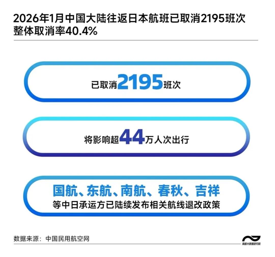根据航班管家DAST计划数据,截至2025年12月22日,2026年1月中国大陆赴日航班取消量已达2195班次,航班取消率为40.4%。