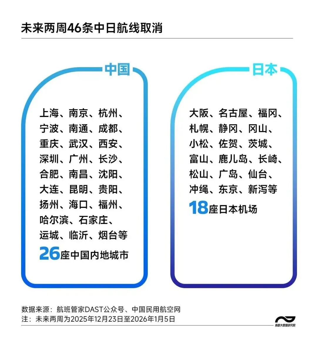 根据航班管家DAST计划数据,2026年1月中国大陆赴日航班取消量已达2195班次,取消率为40.4%。值得关注的是,取消的46条中日航线涉及中日双方共38座机场,预计影响超过44万人次的出行计划。