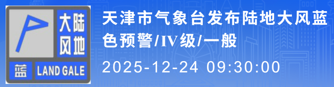 天津市气象台于2025年12月24日09时30分发布陆地大风蓝色预警信号:预计今天傍晚到夜间,我市将有西北风4-5级阵风7级,山区和东部沿海局地阵风8级,请有关单位和人员做好防范准备。