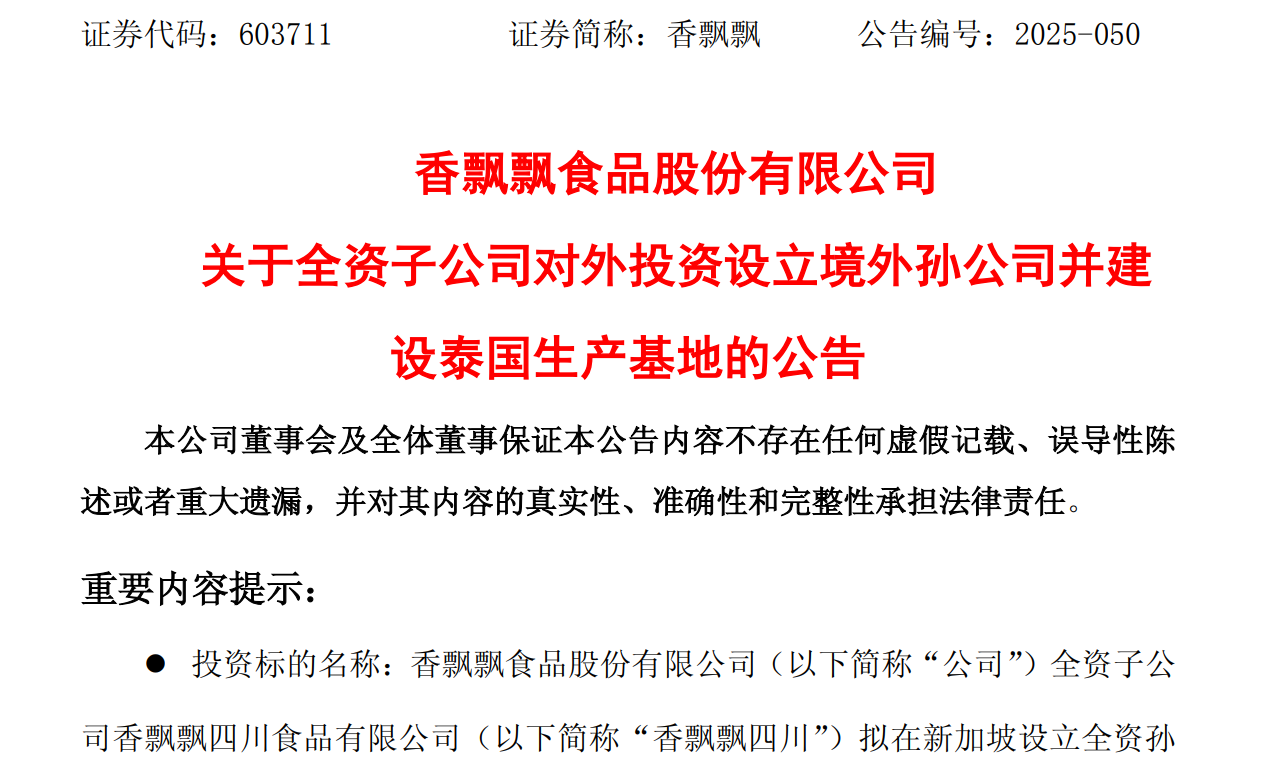 12月23日晚间,香飘飘食品股份有限公司(证券简称“香飘飘”)公告称,为进一步完善公司境外战略布局,推动海外业务发展进程,公司全资子公司香飘飘四川食品有限公司(以下简称“香飘飘四川”)拟以自有资金出资,在新加坡设立全资孙公司SENPURE FOOD (INTERNATIONAL)PTE. LTD.(以下简称“新加坡孙公司”),并由香飘飘四川与新加坡孙公司分别以自有资金出资10%和90%,在泰国设立孙公司YONG MI GUO FOODS (THAILAND) CO., LTD.(以下简称“泰国孙公司”),最终投资建设泰国液体即饮饮料生产基地。项目总投资额3800万美元(折合人民币约2.68亿元),投资款主要用于设立及运营境外公司、购买土地、厂房建设、设备采购等相关事项,实际投资金额以中国及泰国、新加坡当地主管部门批准金额为准。