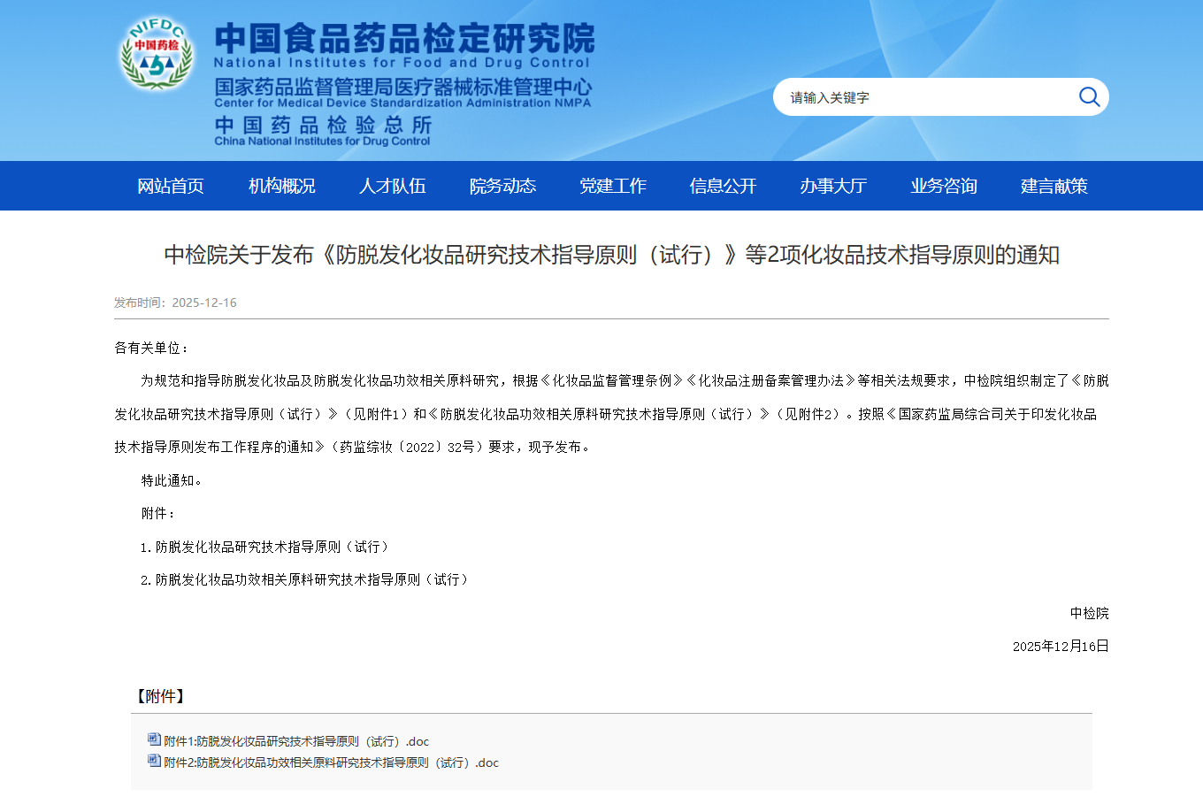 中国食品药品检定研究院关于发布《防脱发化妆品研究技术指导原则(试行)》等2项化妆品技术指导原则的通知