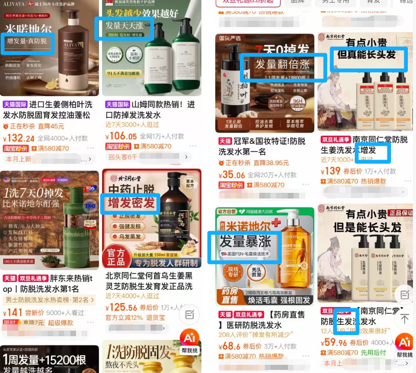 网购平台上,有洗发水产品宣称“发量天天涨”等功效。