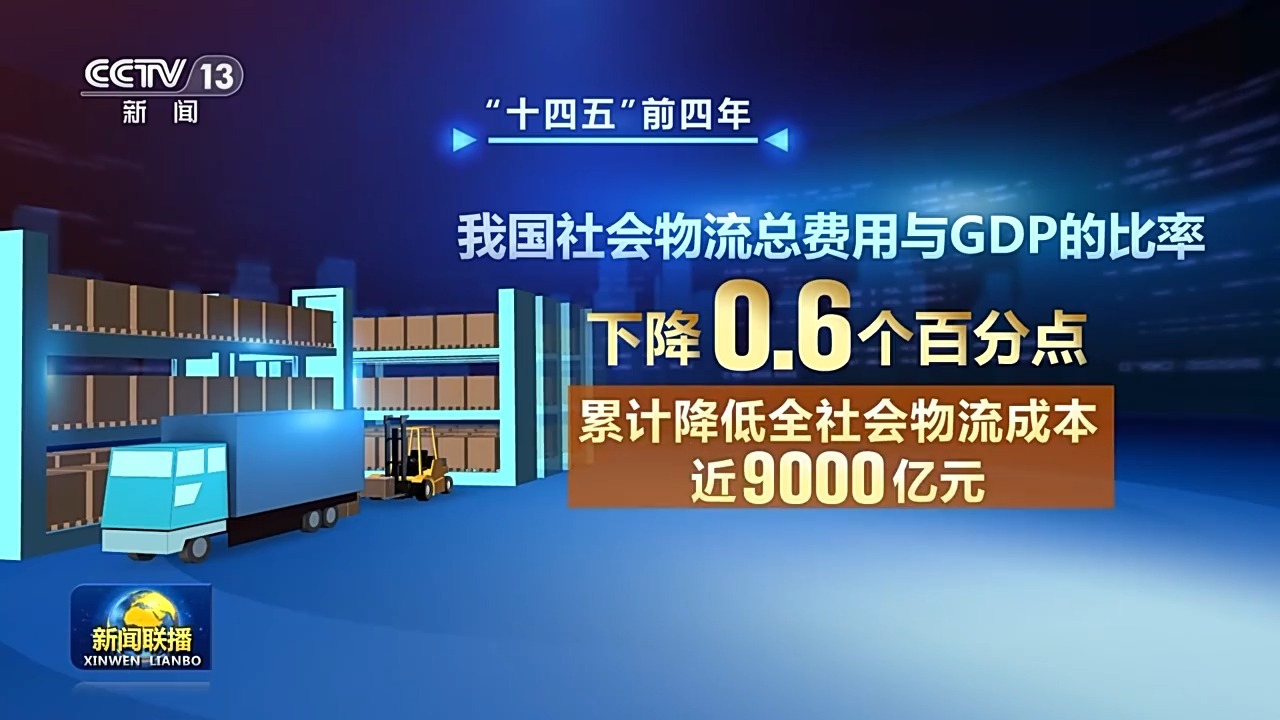 “十四五”前四年,我国社会物流总费用与GDP的比率下降0.6个百分点,累计降低全社会物流成本近9000亿元;今年前三季度,我国社会物流总费用与GDP的比率为14.0%,较去年同期再下降0.1个百分点。