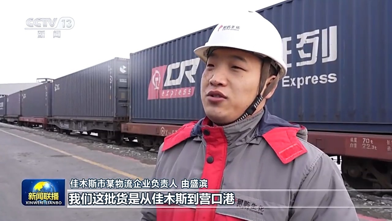 佳木斯市某物流企业负责人 由盛滨:我们这批货是从佳木斯到营口港,再转海运到广州,现在可以一单到底,与以往相比运输时间能节省了8天左右。