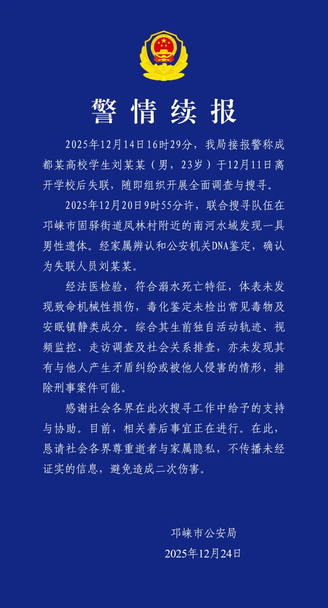 此前报道:刘某某(男,23岁,高校学生)失联,成都邛崃警方通报