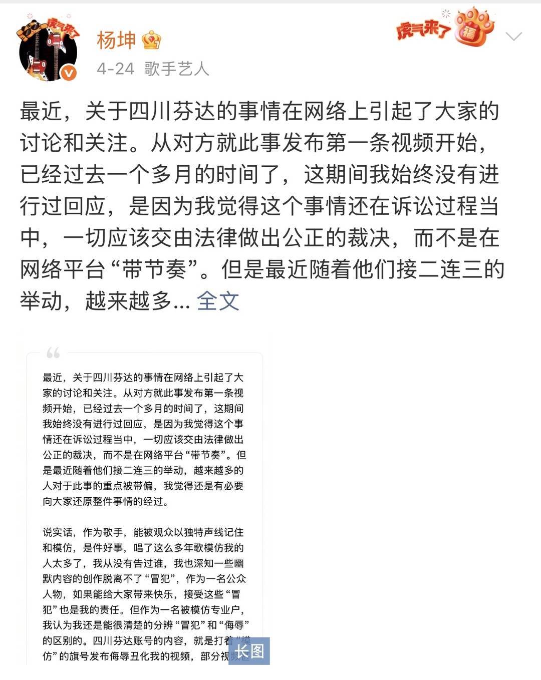 杨坤此前发长文回应起诉一事