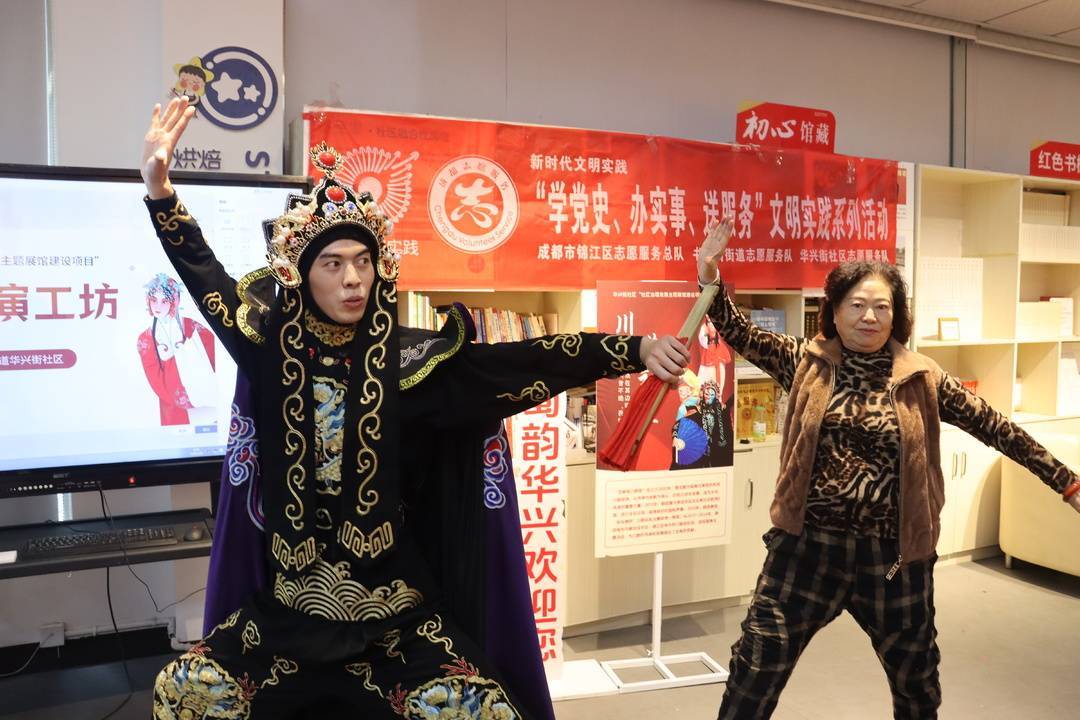华兴街曾是川剧艺术的发源地之一。项目社工链接锦江剧院、“百家班”川剧团等资源,组织《滚灯》《探花》《刀马旦》等经典剧目进社区演出,并邀请专业演员开设“川剧创演工坊”,面向居民群众传授变脸技巧、唱腔基础与身段表演。