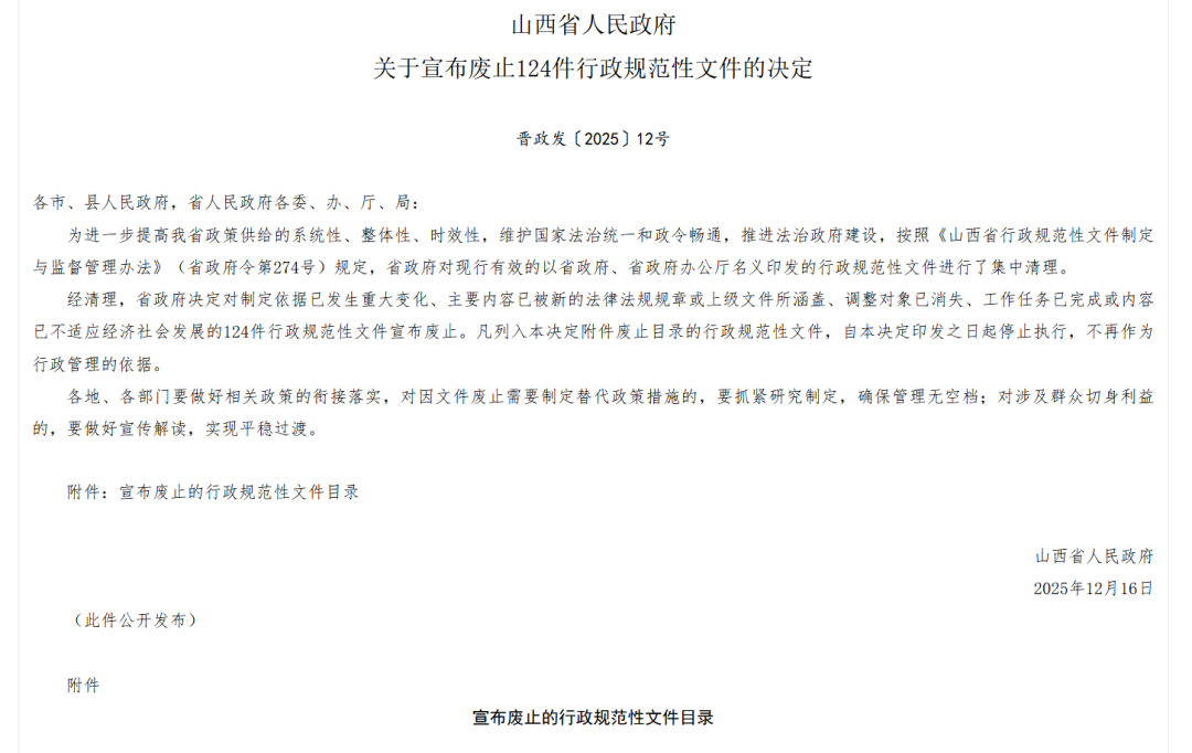 山西省人民政府宣布废止的124件行政规范性文件目录(央广网发 官方网站截图)