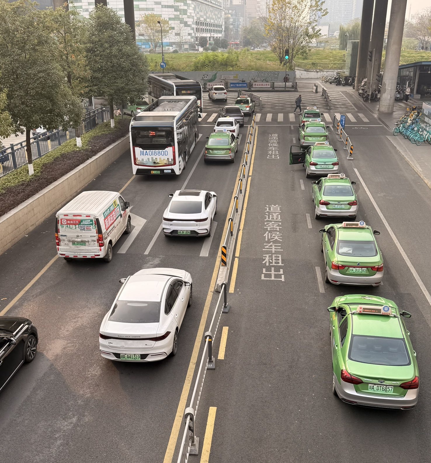 相较于逐利心理,站点先天条件不足更是根本性制约。从站点规模看,南站地处主城区与高新区交界,无扩建空间;从周边环境与交通布局来看,形成“站城交织”的空间格局,大量商圈人流与车站客流叠加,进一步加剧通行压力。更关键的是,站点缺乏立体交通基础,南北两侧被铁路分隔,路网连通性差,无法像成都东站那样实现出租车、网约车、私家车的分层管理。最终,本就不宽的外场道路需同时承载候客、临停、社会通行三类需求,资源长期饱和,少量违规就会打破秩序平衡。